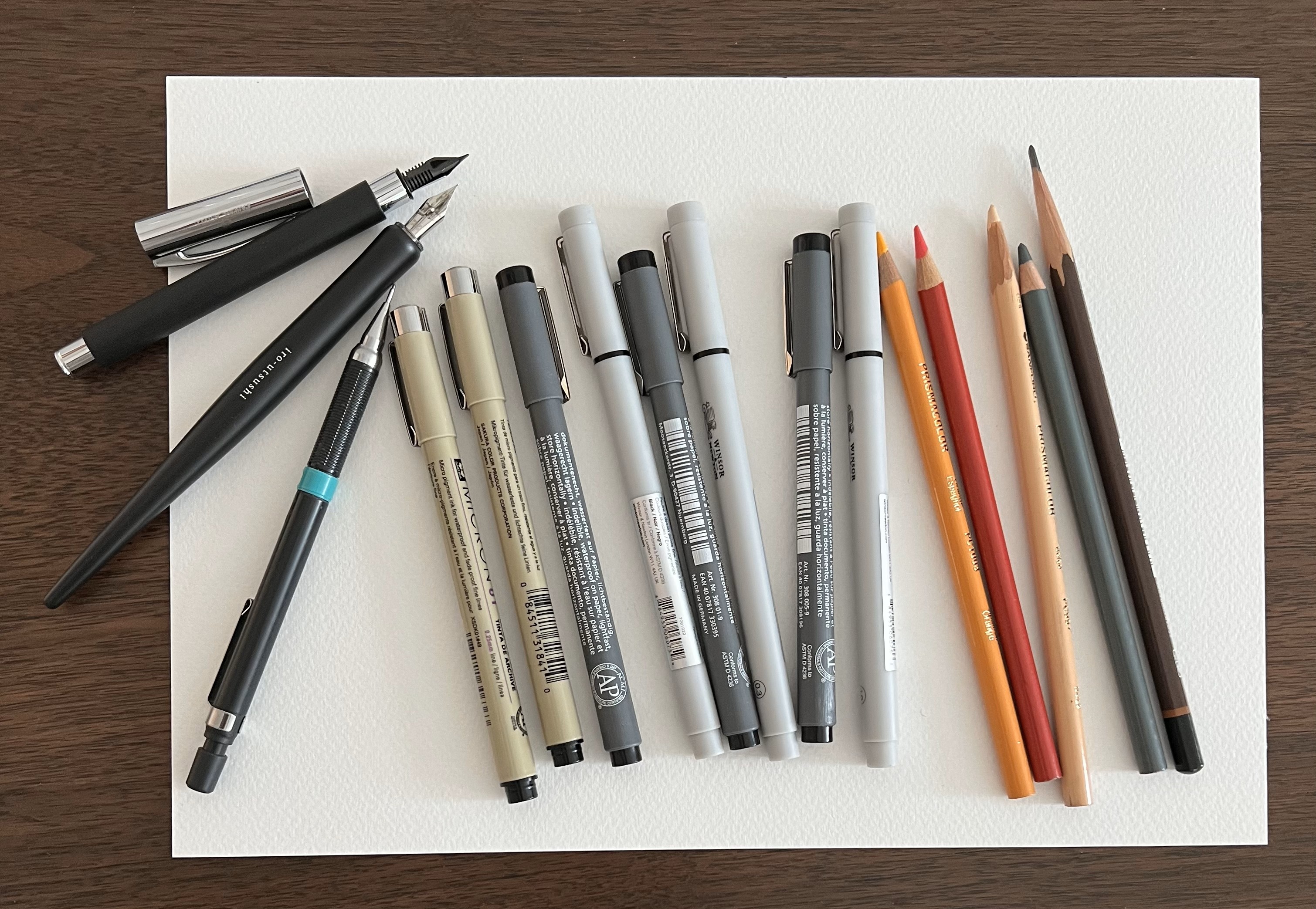 정답은 없습니다. 하지만 저의 경험상 완전 초보자라면 스테들러 피그먼트 라이너 0.1mm와 0.3mm 두 자루로 시작하는 것을 가장 추천합니다. 선이 흔들려도 괜찮습니다. 도구가 주는 안정감이 여러분의 첫 드로잉을 든든하게 지켜줄 것입니다. 이후 선 긋기가 익숙해지면 볼펜으로 필압을 연습해 보고, 자신만의 스타일이 생길 때 만년필에 도전해 보세요.