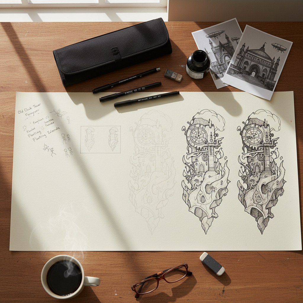 머릿속 아이디어를 완성된 펜 드로잉으로 이끄는 정교한 로드맵입니다.